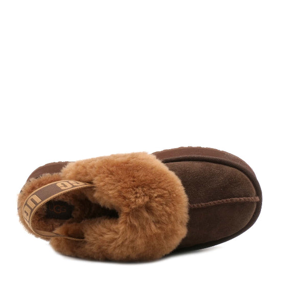 Funkette has the slip on silhouette, bold plateau and soft lining of the original. Made of fine suede with a comfortable sheepskin collar, it has a back strap in addition...